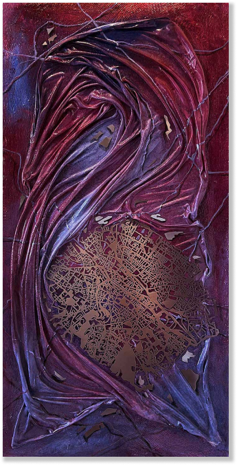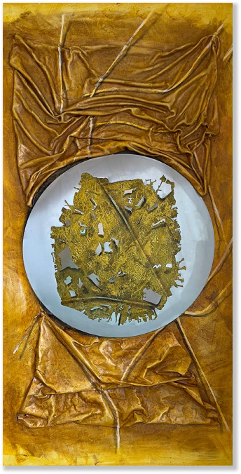 This series employs a new technique developed by the artist and is a culmination of over seven years of research and experimentation. Composed of a combination of metal, paint and various mixed media on canvas, the elements come together to forge intriguing, highly reflective works that tantalise viewers.