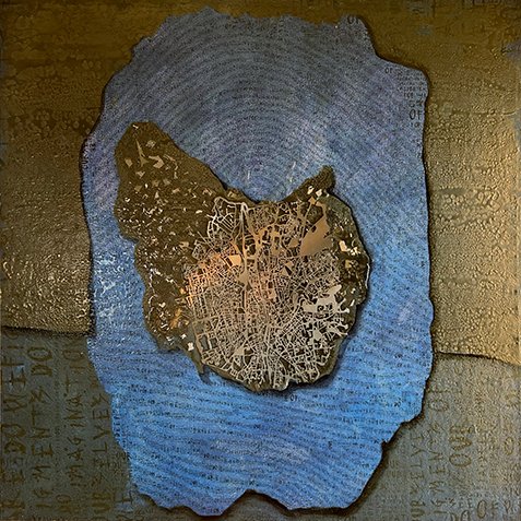 This series employs a new technique developed by the artist and is a culmination of over seven years of research and experimentation. Composed of a combination of metal, paint and various mixed media on canvas, the elements come together to forge intriguing, highly reflective works that tantalise viewers